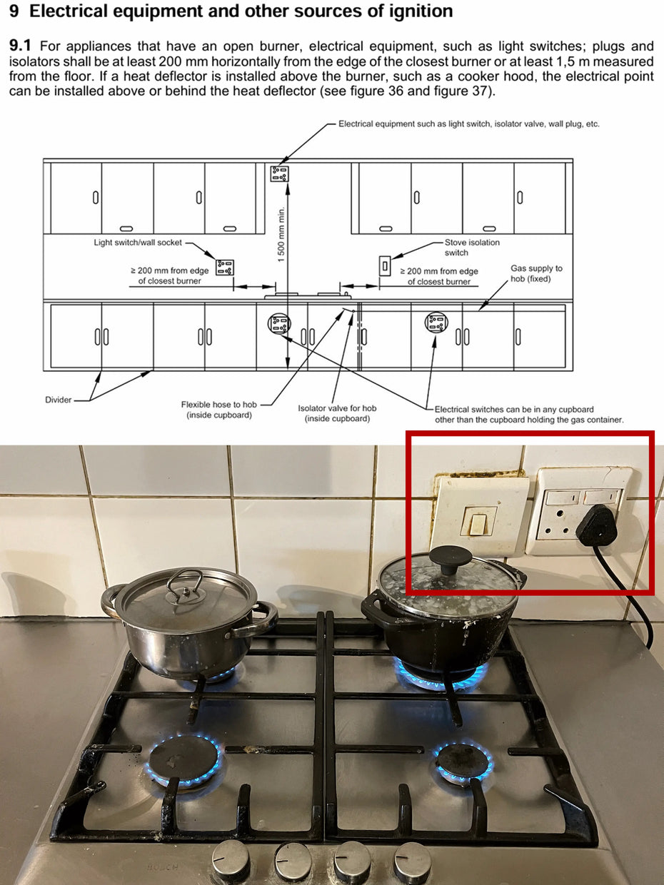 isolators shall be at least 200 mm horizontally from the edge of the closest burner or at least 1,5 m measured